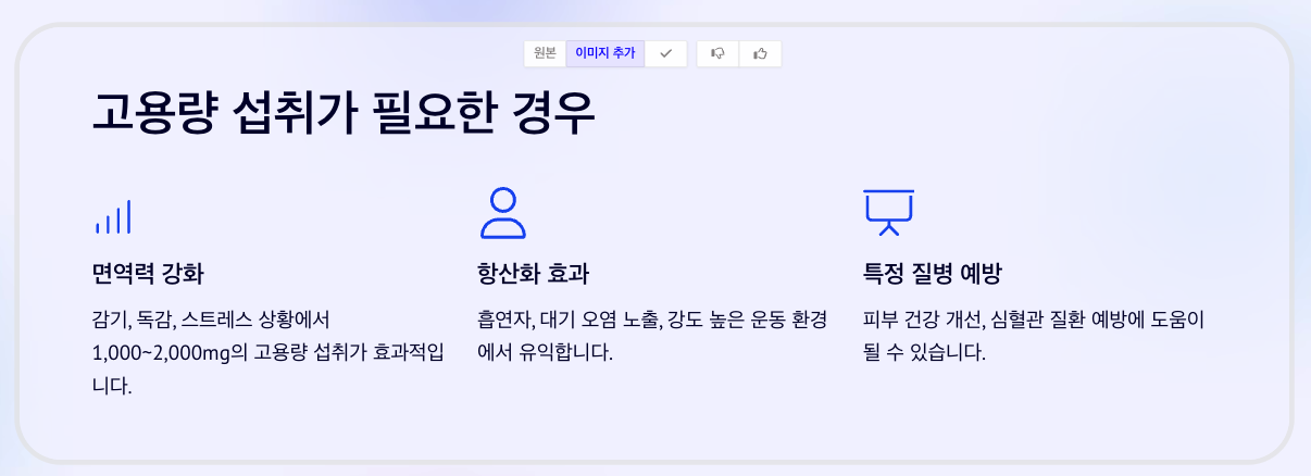 - 감기나 독감 증상이 있을 때: 연구에 따르면 비타민C를 고용량(1,000~2,000mg)으로 섭취하면 증상의 지속 기간을 줄이는 데 도움이 될 수 있습니다.