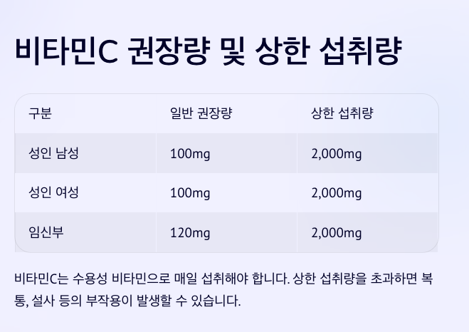- 비타민C는 수용성 비타민으로 체내에 축적되지 않으므로, 매일 꾸준히 섭취해야 합니다.